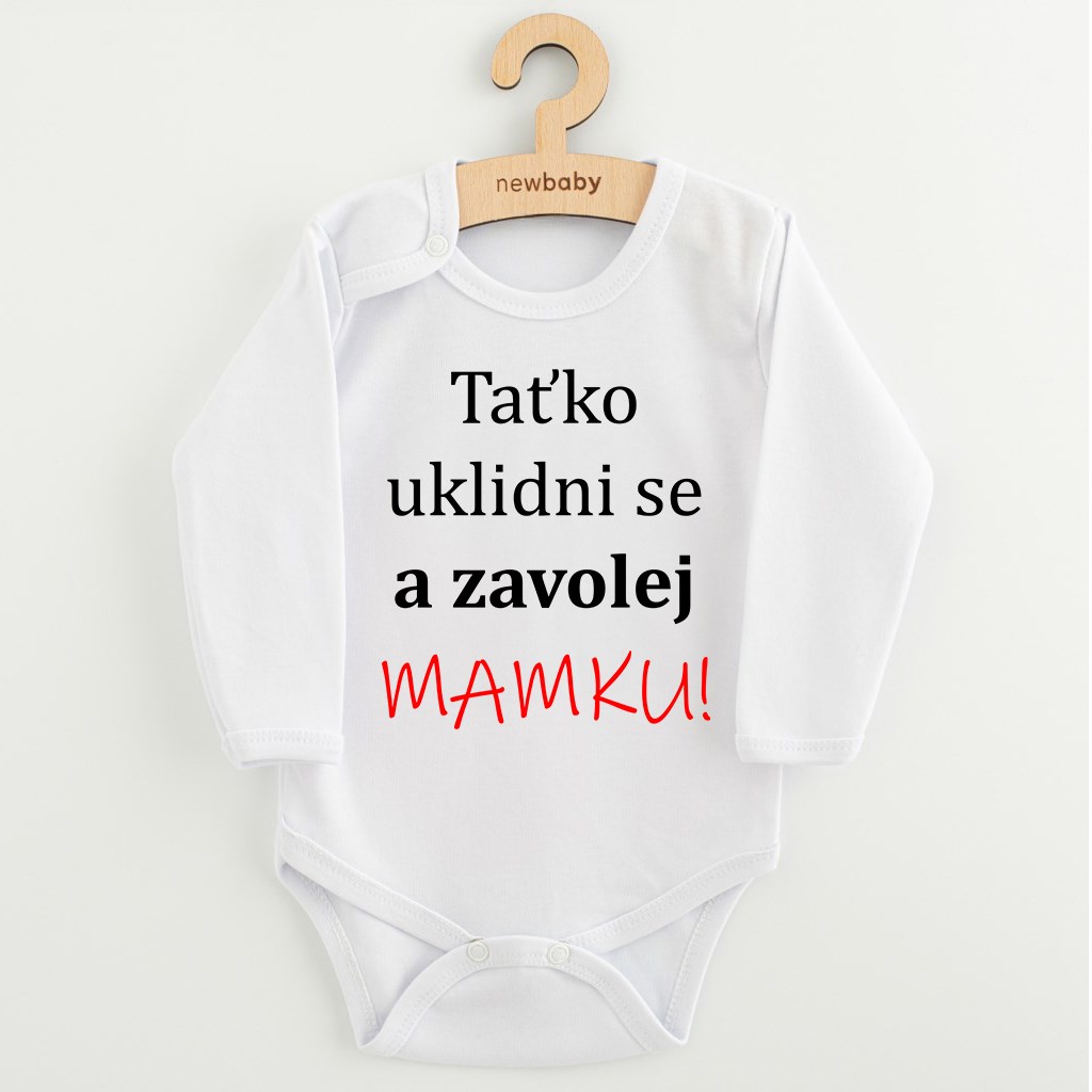 Originální bavlněné kojenecké body s dlouhým rukávem New Baby, s vtipným nápisem Taťko uklidni se a zavolej MAMKU! Barvy použité k potisku jsou certifikované a vhodné pro miminka. Je vyrobeno z příjemného a kvalitního materiálu, ve kterém se bude Vaše miminko cítit příjemně. Body má zapínáni na cvočky na ramínku a mezi nožičkami, což usnadňuje oblékání a přebalování. Dopřejte Vašemu miminku vyniknout v originálním body. Složení: 100% bavlna. Rozměry: obvod kolem hrudníku cca 50 cm, délka rukávu cca 26 cm, celková délka cca 42 cm.