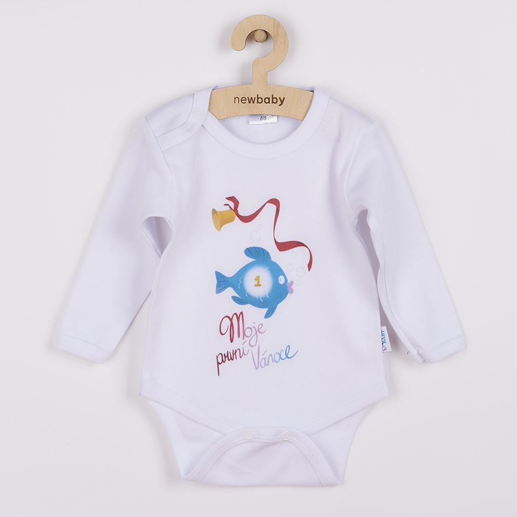 Originální bavlněné kojenecké body s dlouhým rukávem New Baby, s vtipným nápisem Moje první Vánoce a obrázkem vánočního kapříka. Barvy použité k potisku jsou certifikované a vhodné pro miminka. Je vyrobeno z příjemného a kvalitního materiálu, ve kterém se bude Vaše miminko cítit příjemně. Body má zapínáni na cvočky na ramínku a mezi nožičkami, což usnadňuje oblékání a přebalování. Dopřejte Vašemu miminku vyniknout v originálním body. Složení: 100% bavlna. Rozměry: obvod kolem hrudníku cca 34 cm, délka rukávu cca 16 cm, celková délka cca 30 cm.