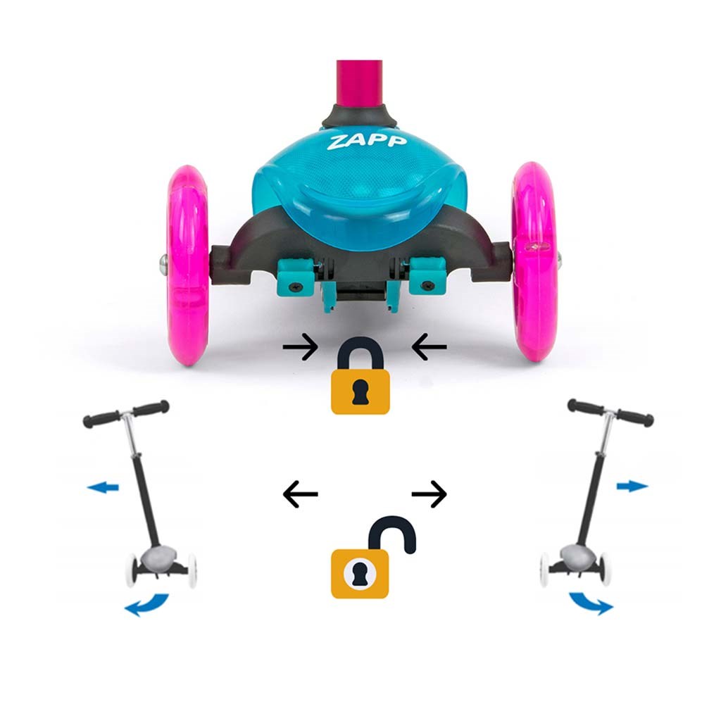 Abychom vyhověli potřebám našich malých závodníků, vytvořili jsme koloběžku ZAPP. Je ideálním řešením pro aktivní děti, které mají rády pohyb. Zapp je vyroben z kvalitních materiálů, je ideální na procházky nebo řádění kolem domu. Kovová konstrukce zaručuje odolnost výrobku. Koloběžka má navíc brzdu a blatník na zadním kolečku. Řízení a zatáčení pracuje na principu změny rovnováhy těla. Velkou výhodou koloběžky jsou 3 kola, které poskytnou stabilitu a bezpečnost. Děti potěší také, svítíci přední kola během jízdy.