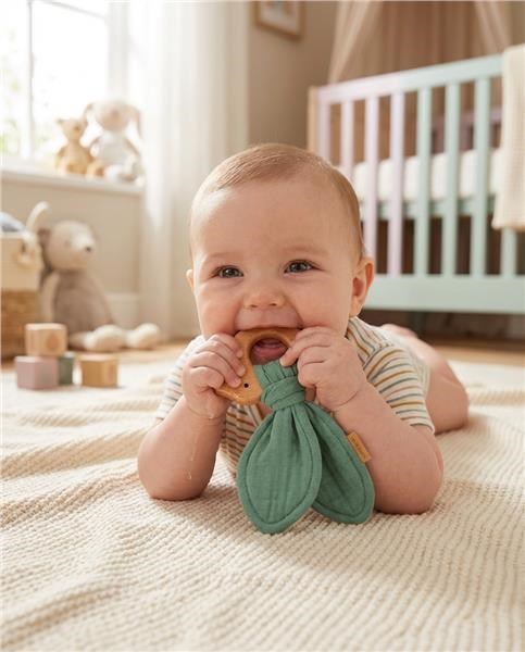Kousátko s mušelínovou plenou je ideální sada, když se dítěti prořezávají zoubky. Kousátko je vyrobeno z bukového dřeva šetrného ke středu a měkké mušelínové látky. Zcela bezpečné pro děti přináší uklidňující úlevu při prořezávání zoubků. Kousátko lze použít také jako hračku pro miminka. Kousátko se dokonale hodí k našim dalším mušelínovým výrobkům a vytváří tak krásnou sadu, kterou lze darovat na dětskou oslavu.