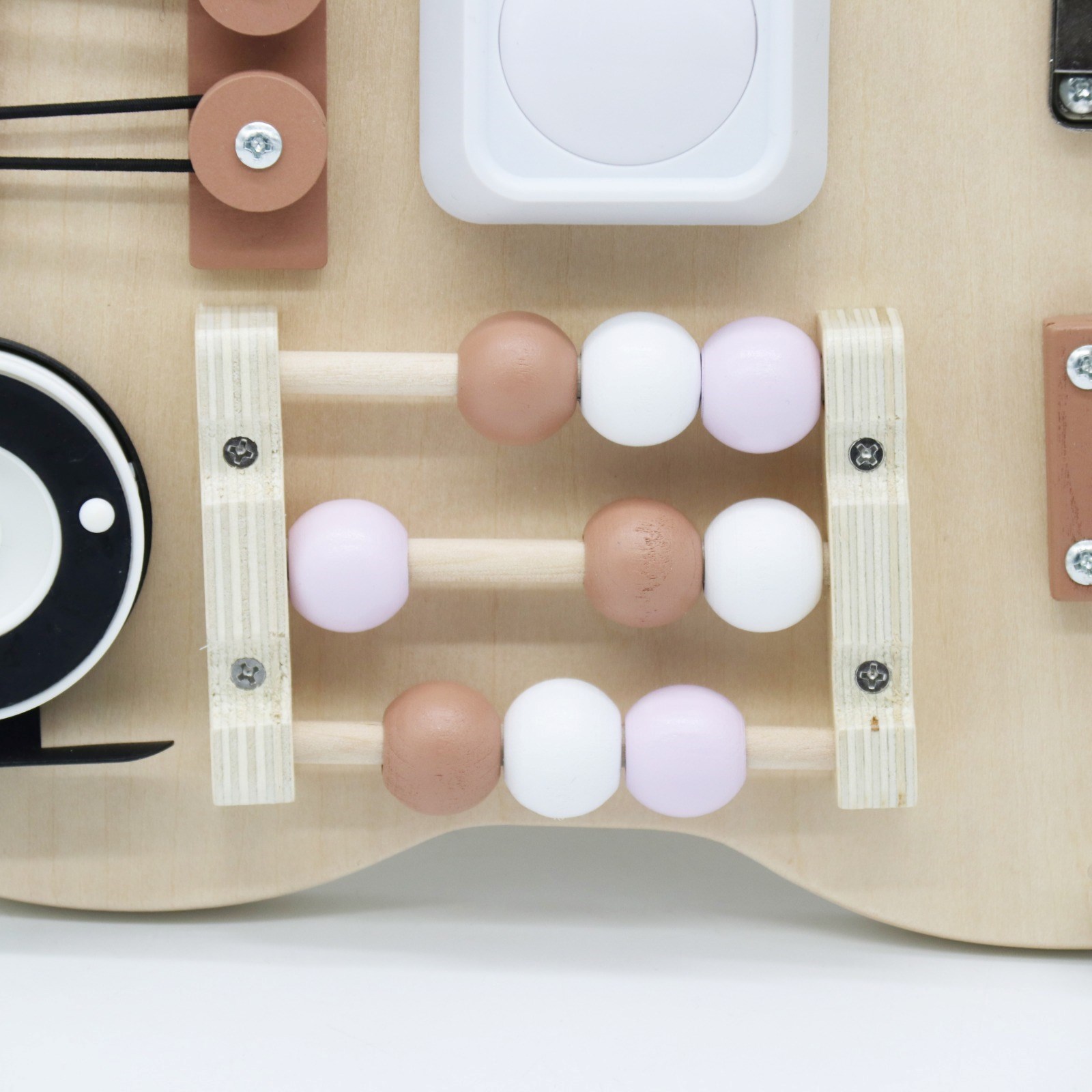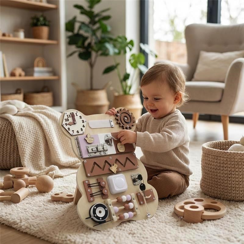 Dřevěná manipulační tabule Busy Board ve tvaru medvídka zabaví děti na dlouhé hodiny a zároveň podporuje jejich přirozený vývoj. Díky kombinaci různých prvků si dítě procvičuje jemnou motoriku, trpělivost i logické myšlení – a to zábavnou a bezpečnou formou.