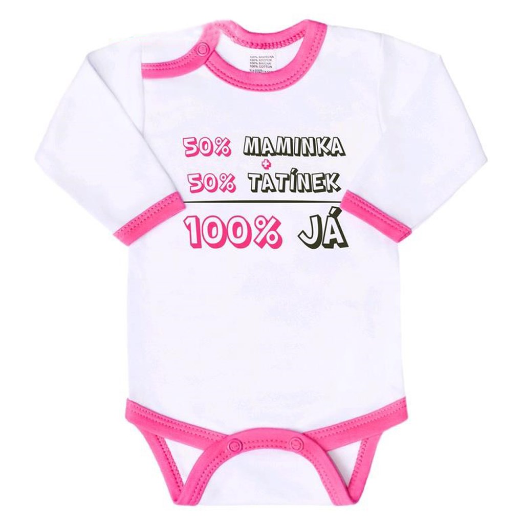 Originální bavlněné kojenecké body s dlouhým rukávem New Baby, s vtipným nápisem 50% MAMINKA + 50% TATÍNEK - 100% JÁ. Body má kolem krčku, nožiček a ručiček barevné lemování. Barvy použité k potisku jsou certifikované a vhodné pro miminka. Je vyrobeno z příjemného a kvalitního materiálu, ve kterém se bude Vaše miminko cítit příjemně. Body má zapínáni na cvočky na ramínku a mezi nožičkami, což usnadňuje oblékání a přebalování. Dopřejte Vašemu miminku vyniknout v originálním body. Složení: 100% bavlna. Rozměry: obvod kolem hrudníku cca 50 cm, délka rukávu cca 26 cm, celková délka cca 42 cm.