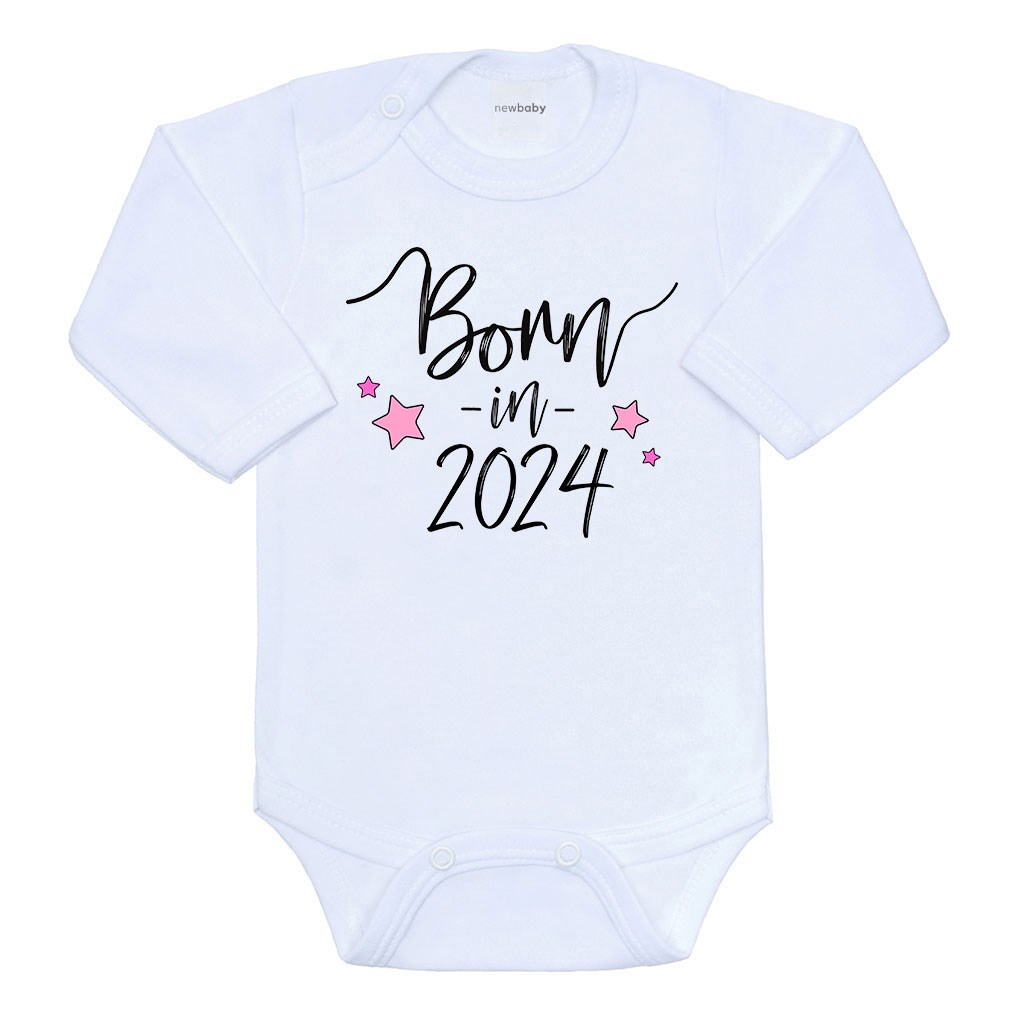 Originální bavlněné kojenecké body s dlouhým rukávem New Baby s nápisem Born in 2024. Barvy použité k potisku jsou certifikované a vhodné pro miminka. Je vyrobeno z příjemného a kvalitního materiálu, ve kterém se bude Vaše miminko cítit příjemně. Body má zapínáni na cvočky na ramínku a mezi nožičkami, což usnadňuje oblékání a přebalování. Dopřejte Vašemu miminku vyniknout v originálním body. Složení: 100% bavlna.