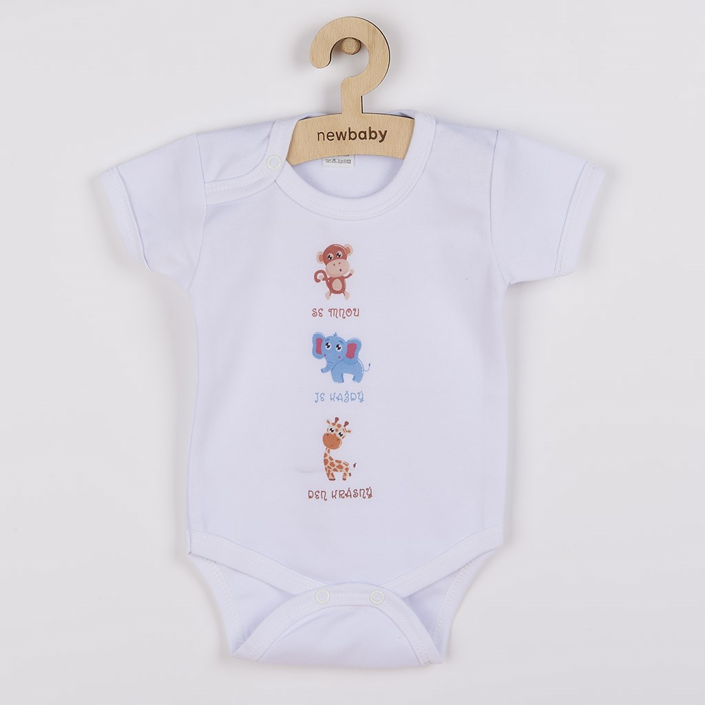 Originální bavlněné kojenecké body s krátkým rukávem New Baby s nápisem Se Mnou Je Každý Den Krásný a obrázkem. Barvy použité k potisku jsou certifikované a vhodné pro miminka. Je vyrobeno z příjemného a kvalitního materiálu, ve kterém se bude Vaše miminko cítit příjemně. Body má zapínáni na cvočky na ramínku a mezi nožičkami, což usnadňuje oblékání a přebalování. Dopřejte Vašemu miminku vyniknout v originálním body. Složení: 100% bavlna.