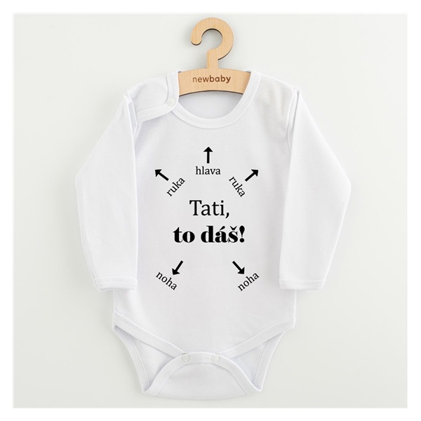 Originální bavlněné kojenecké body s dlouhým rukávem New Baby, s vtipným nápisem Tati, to dáš! Barvy použité k potisku jsou certifikované a vhodné pro miminka. Je vyrobeno z příjemného a kvalitního materiálu, ve kterém se bude Vaše miminko cítit příjemně. Body má zapínáni na cvočky na ramínku a mezi nožičkami, což usnadňuje oblékání a přebalování. Dopřejte Vašemu miminku vyniknout v originálním body. Složení: 100% bavlna. Rozměry: obvod kolem hrudníku cca 46 cm, délka rukávu cca 24 cm, celková délka cca 40 cm.