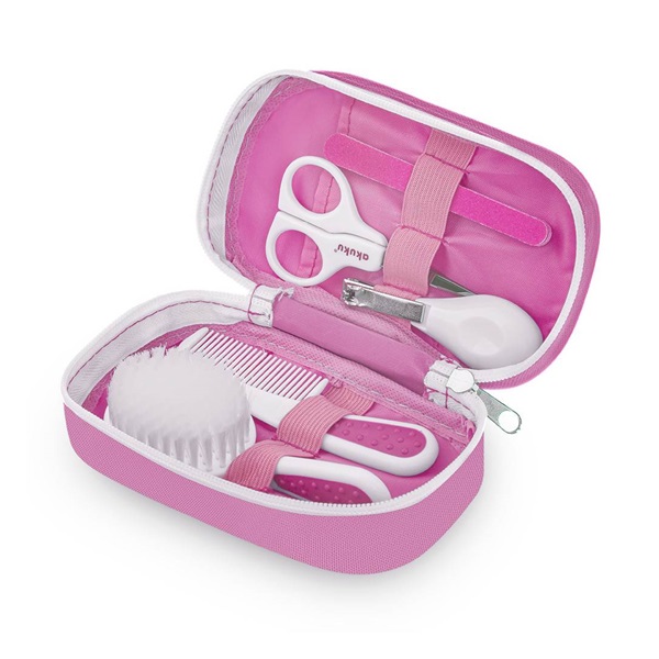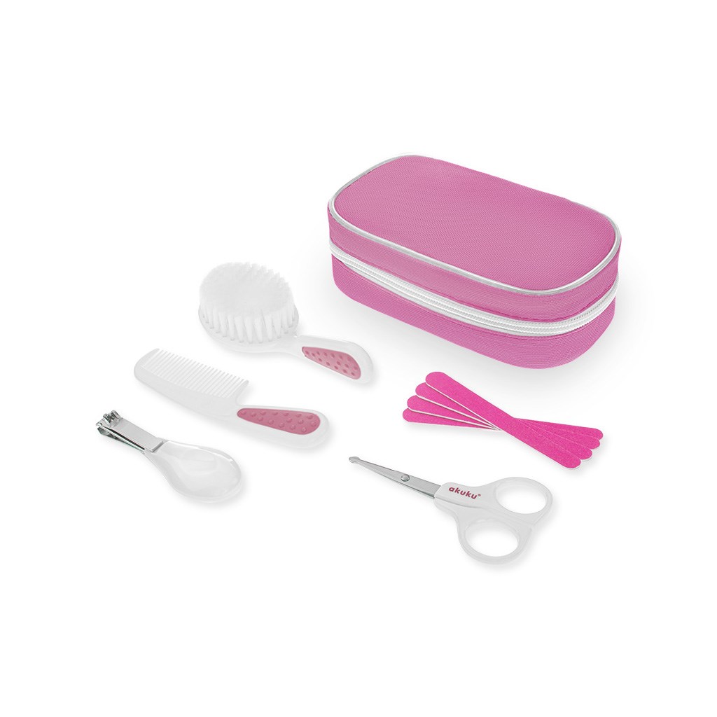 Dětská sada na manikúru Akuku, která umožňuje bezpečnou péči o dětské nehtíky. Sada obsahuje nůžky, kartáček a hřeben na vlasy, kleštičky a čtyři pilníky na nehty. Pilník vyhladí případné nerovnosti a zabrání se případnému poškrábání. Zaoblené tvary nůžek snižují riziko poranění dítěte a kleštičky nehty zkrátí. Celá manikúra je v krásném textilním pouzdře. Vhodné pro děti od narození.