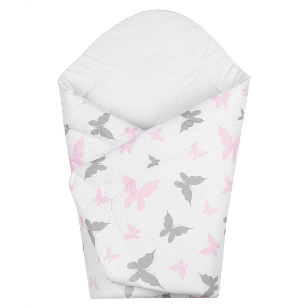 Dětská zavinovačka New Baby. Zavinovačku zdobí motýlci. Zapínání na suchý zip. Rozměry cca 75x75 cm. Složení: povlak 100% bavlna, výplň 100% polyester. Umístění vzoru na zavinovačce se z důvodu strojové výroby mírně liší.