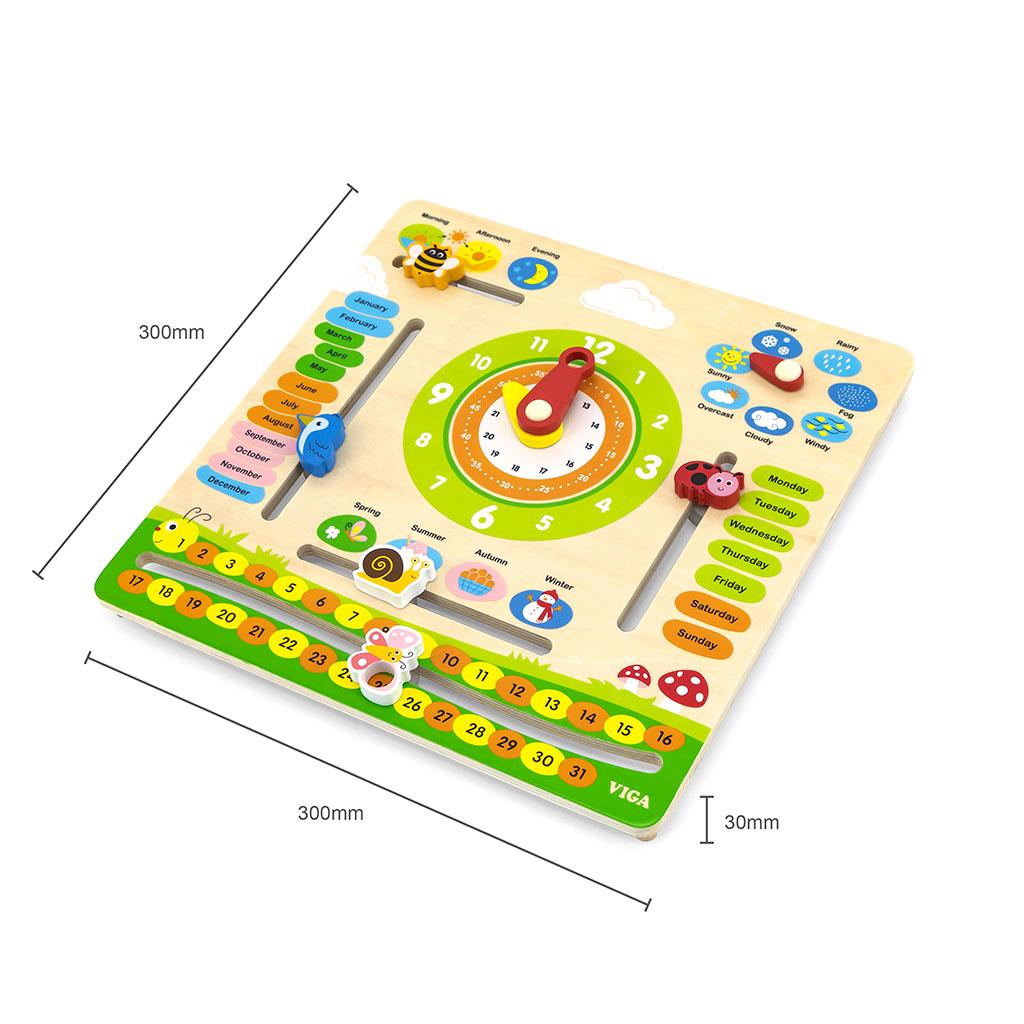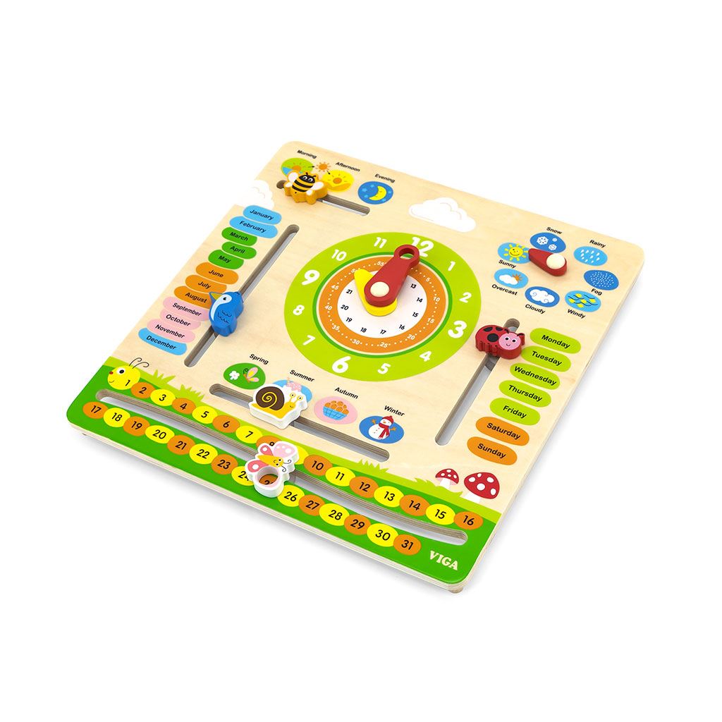 Poznávání světa s dřevěným kalendářem s hodinami v angličtině od společnosti Viga Toys je ideální "výukovou" a dárkovou sadou, vhodnou do hodin angličtiny jako názorný materiál. Učení hodin na analogových hodinách bude s deskou Viga jednodušší a hra s kalendářem podpoří učení čtení a psaní data. Dítě se naučí názvy měsíců, dnů v týdnu, ročních období a dnů a pojmy související s počasím v angličtině. Díky výukové tabuli budou moci rychlí žáci objevovat a učit se a zároveň se bavit. Sada pro učení času je vhodná také pro rozvoj Montessori. Ideální hračka k zavěšení doma, ve školce nebo ve škole.