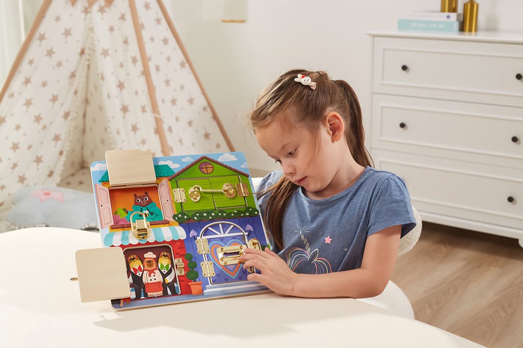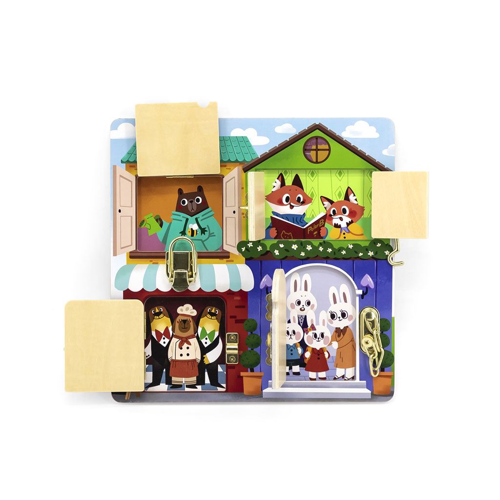 Dřevěná manipulační deska ve tvaru domečku výborně rozvíjí smyslové a logické myšlení dítěte. Hračka navržená společností Viga svým neobvyklým tvarem rozvíjí představivost dítěte, které "otevírá a zavírá" zámky na senzorické desce. Na dřevěné desce jsou 4 páry dveří a za každými dveřmi je jiný obrázek. Hrající si batole musí vymyslet, jak otevřít různé typy zámků, a když se mu to podaří, uvidí za dveřmi různá zvířátka: jednoho medvídka, dvě lišky, tři psy nebo čtyři králíky. Každé dveře se zavírají jiným typem zámku.