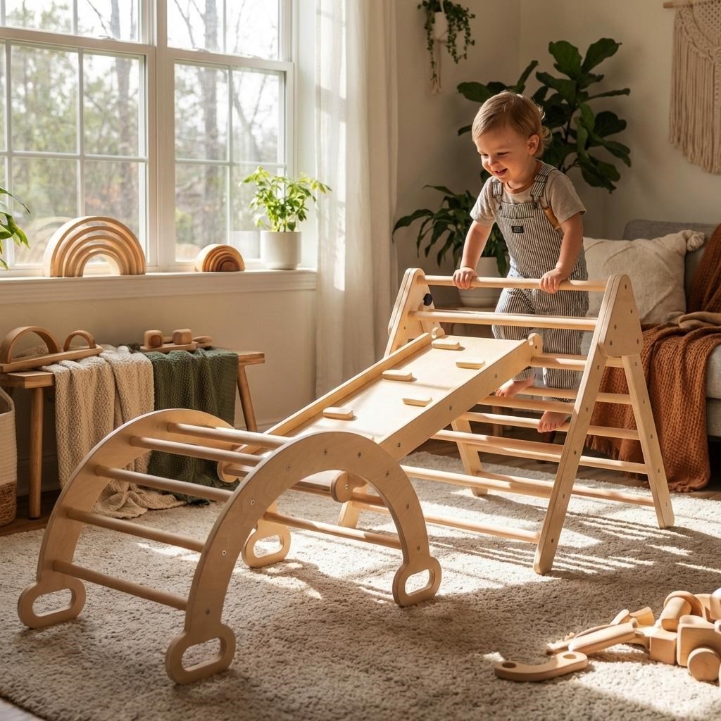 Dřevěná Montessori (Pikler) lezecká sestava Baby Mix pomáhá dětem přirozeně rozvíjet pohyb, rovnováhu i sebevědomí. Díky variabilní konstrukci se skládá z několika prvků, které lze kombinovat a přizpůsobit věku i dovednostem dítěte.