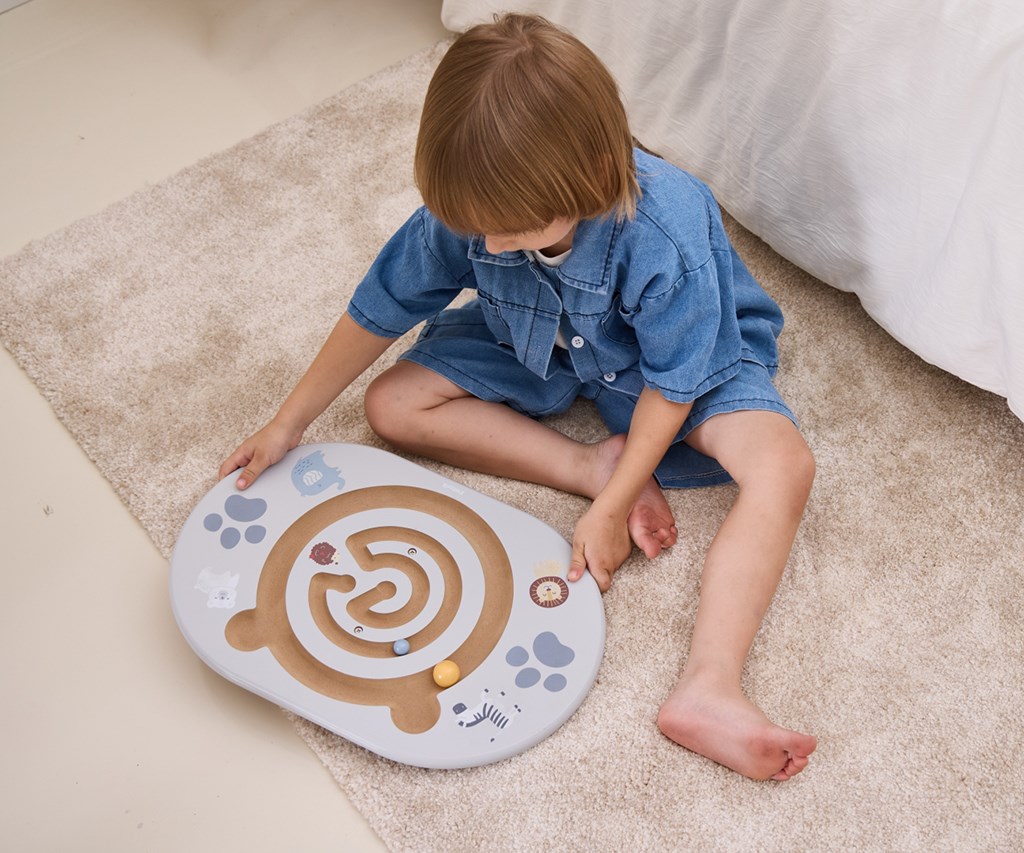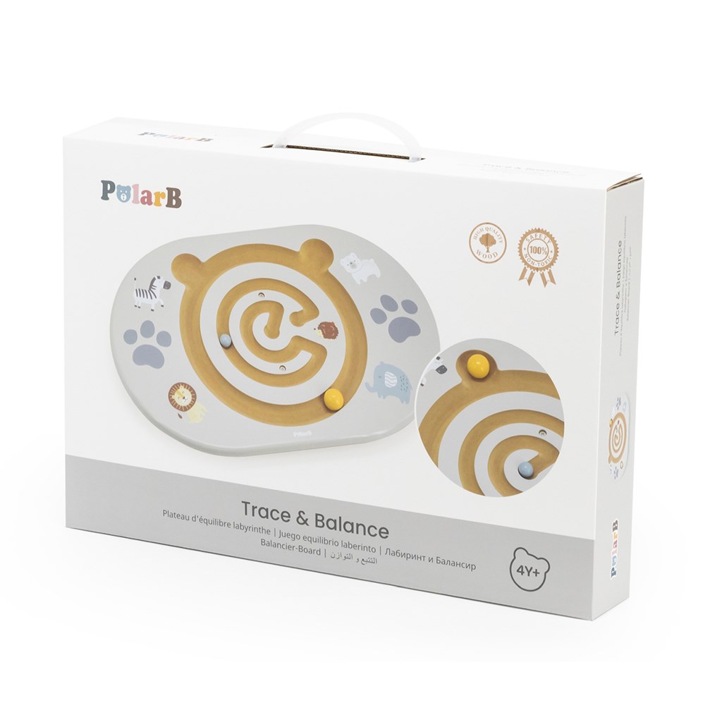 Balancující labyrint je ideální hračka pro děti od 4 let, která podporuje rozvoj rovnováhy, pohybové koordinace a koncentrace. Sada obsahuje balanční desku s vyfrézovaným labyrintem ve tvaru medvídka a dvě dřevěné kuličky. Úkolem dítěte je pomocí balancování posouvat kuličku po dráze, čímž si hravou formou trénuje rovnováhu a kontrolu těla.