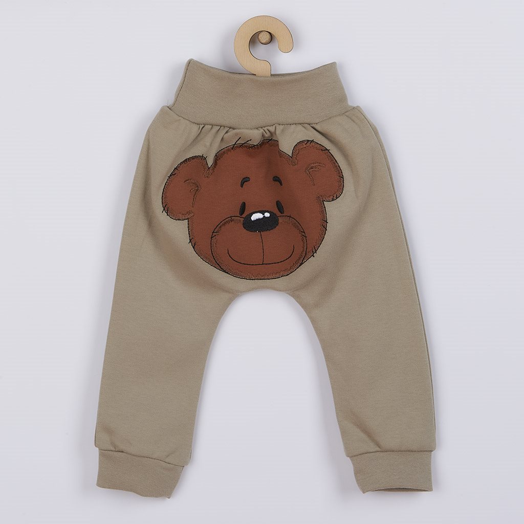 Nápadité bavlněné tepláčky české značky New Baby BrumBrum pro miminka. Tepláčky jsou na zadečku zdobeny roztomilou nášivkou s medvídkem. Nášivka je podlepená látkou proti poškrábání. V pase mají široký pružný lem, který netlačí na bříško miminka. Díky příjemnému a kvalitnímu materiálu se miminko bude cítit velmi příjemně a pohodlně. Složení: 100% bavlna.