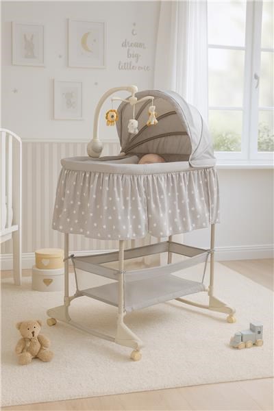 Multifunkční dětská kolébka New Baby je ideální volbou jak pro děti, tak pro rodiče, pro které je klíčová funkčnost a bezpečí. Výrobek slouží jako postýlka i kolébka. Její mobilita poskytuje obrovské pohodlí, protože dítě bude vždy v blízkosti svých rodičů. Praktický koš vám umožní mít vše potřebné na dosah ruky a včas reagovat na potřeby mrňouska, aniž byste se od něj museli vzdalovat. Potah kolébky je vyroben z prodyšného a příjemného na dotek materiálu, který lze snadno sundat a vyprat. Kolotoč s barevnými zvířátky je vybaven nočním světlem, hudebním modulem s 8 melodiemi a funkcí jemných vibrací s možností změny jejich intenzity. Je napájen 3 bateriemi AA LR6-1,5 V (nejsou součástí dodávky). Jednu ze stran postýlky lze rozepnout, což oceníte během každodenní a často i noční péči o Vaše děťátko.