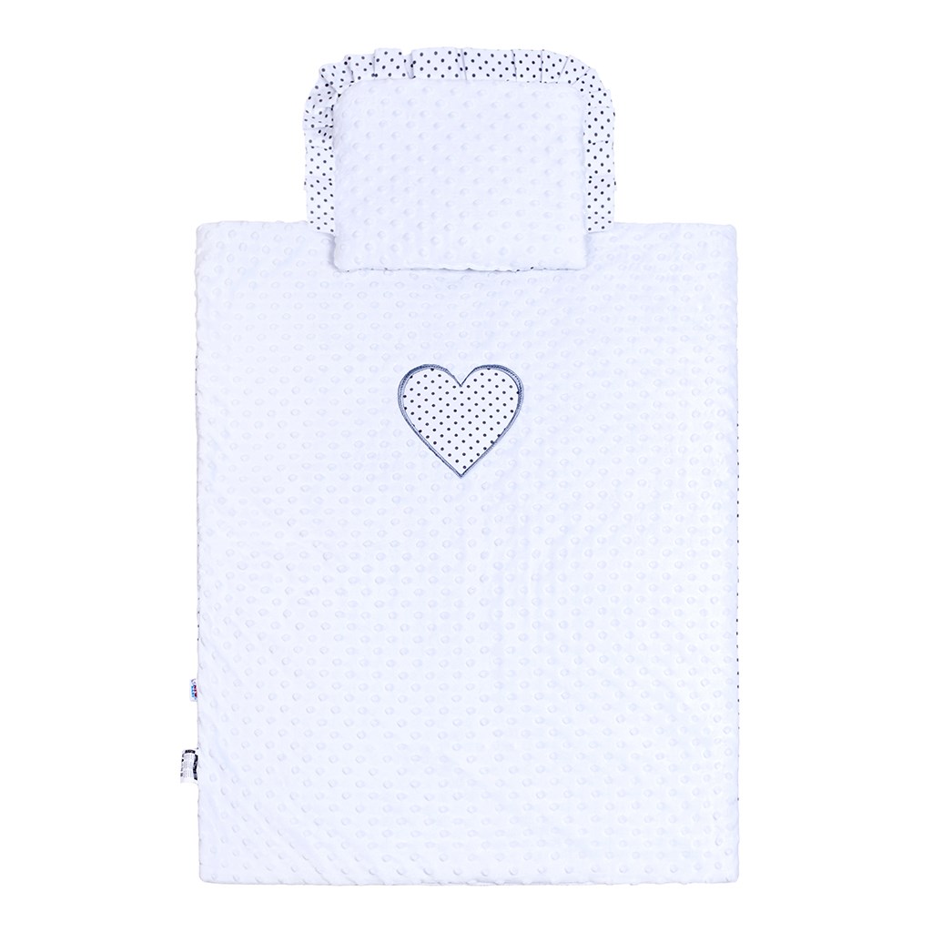 Oboustranný set z Minky New Baby do kočárku. Z jedné strany je minky materiál a z druhé strany bavlněná látka celopotištěná puntíky. Set obsahuje polštářek, který je ozdoben volánkem, a přikrývku, která má na straně minky našité krásné velké puntíkové srdíčko. Klademe důraz na kvalitu a proto jsou peřinky do kočárku ušity z velmi kvalitního materiálu, který nepouští barvu, a nevyvolává alergické reakce. Vše je vyplněno antialergickým vláknem. Složení: povlak 100% bavlna, 100% polyester, výplň 100% polyester. Rozměry: polštářek: cca 25x32 cm, peřinka: cca 82x68 cm. Tyto výrobky jsou bezpečné, protože: